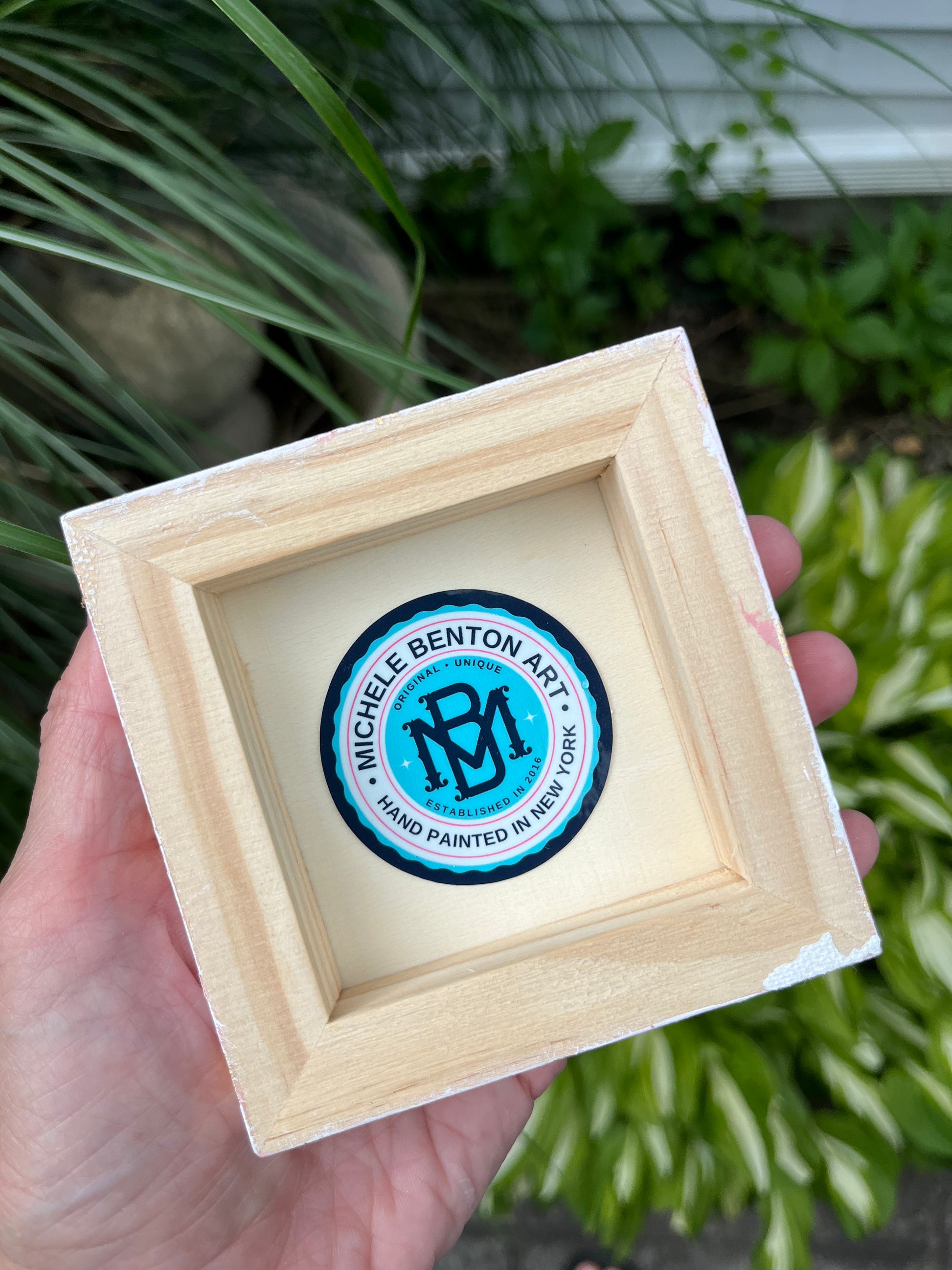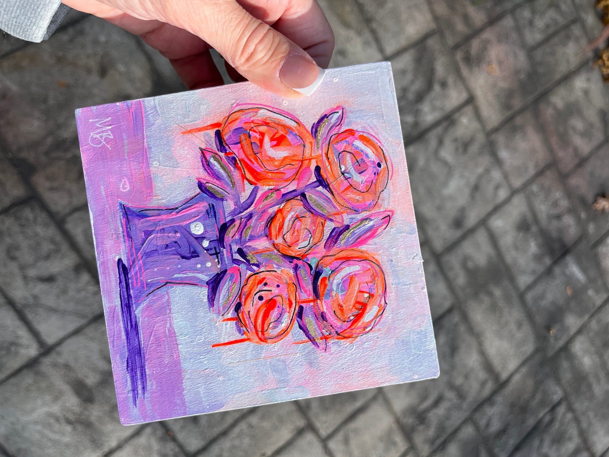 This mini bouquet painting measures 5”x5” and has been painted and varnished on a cradled wood panel. The leaves have gold leaf accents, which also continue as stripes on each side of the artwork. The perfect size to collect or gift to someone special!