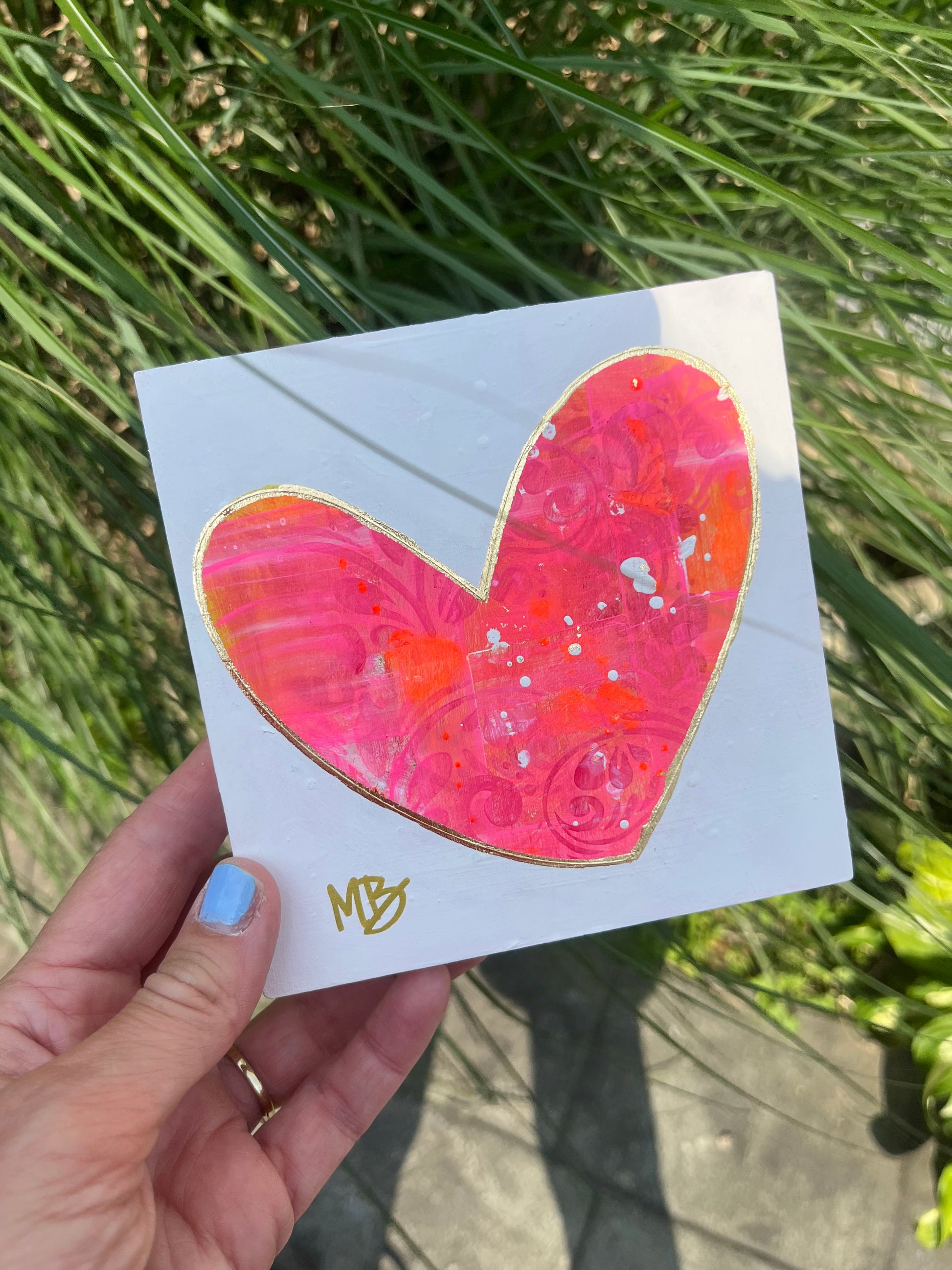This mini heART painting measures 5”x5” and has been painted and varnished on a cradled wood panel. Each heart is lined with gold leaf, which also adorns each side of the artwork.