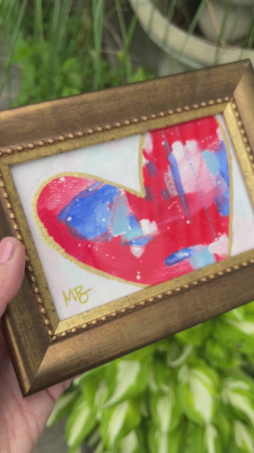 This mini heART painting on watercolor paper is displayed in an 5x7 frame. Each heart is lined with gold leaf. The perfect size to collect or gift to someone special!