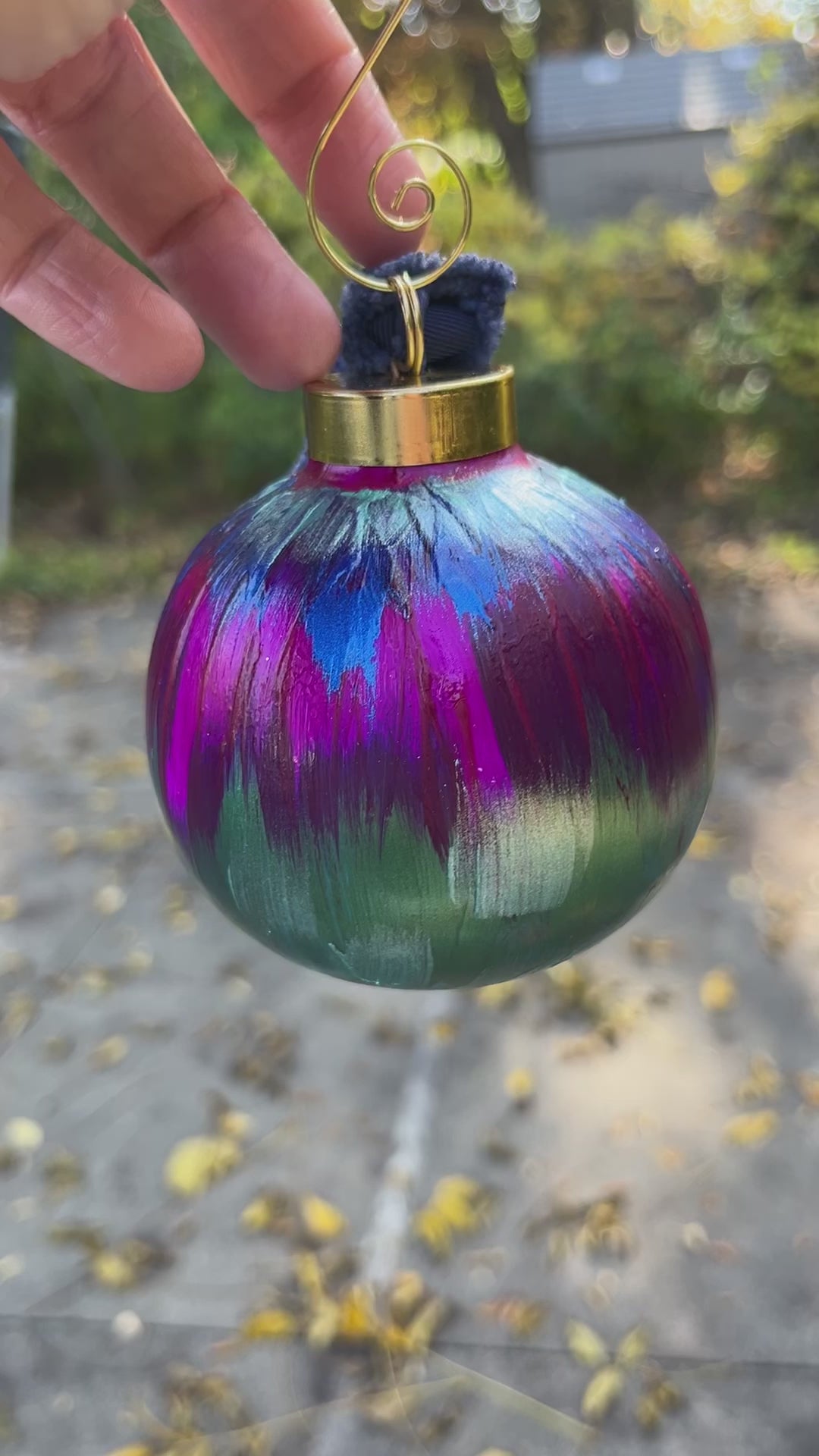 Celebrate the holiday season with this cheerful hand-painted porcelain ornament by Michele Benton. The festive design showcases a rich jewel tones in blue, violet, and green, making it a vibrant addition to your tree.