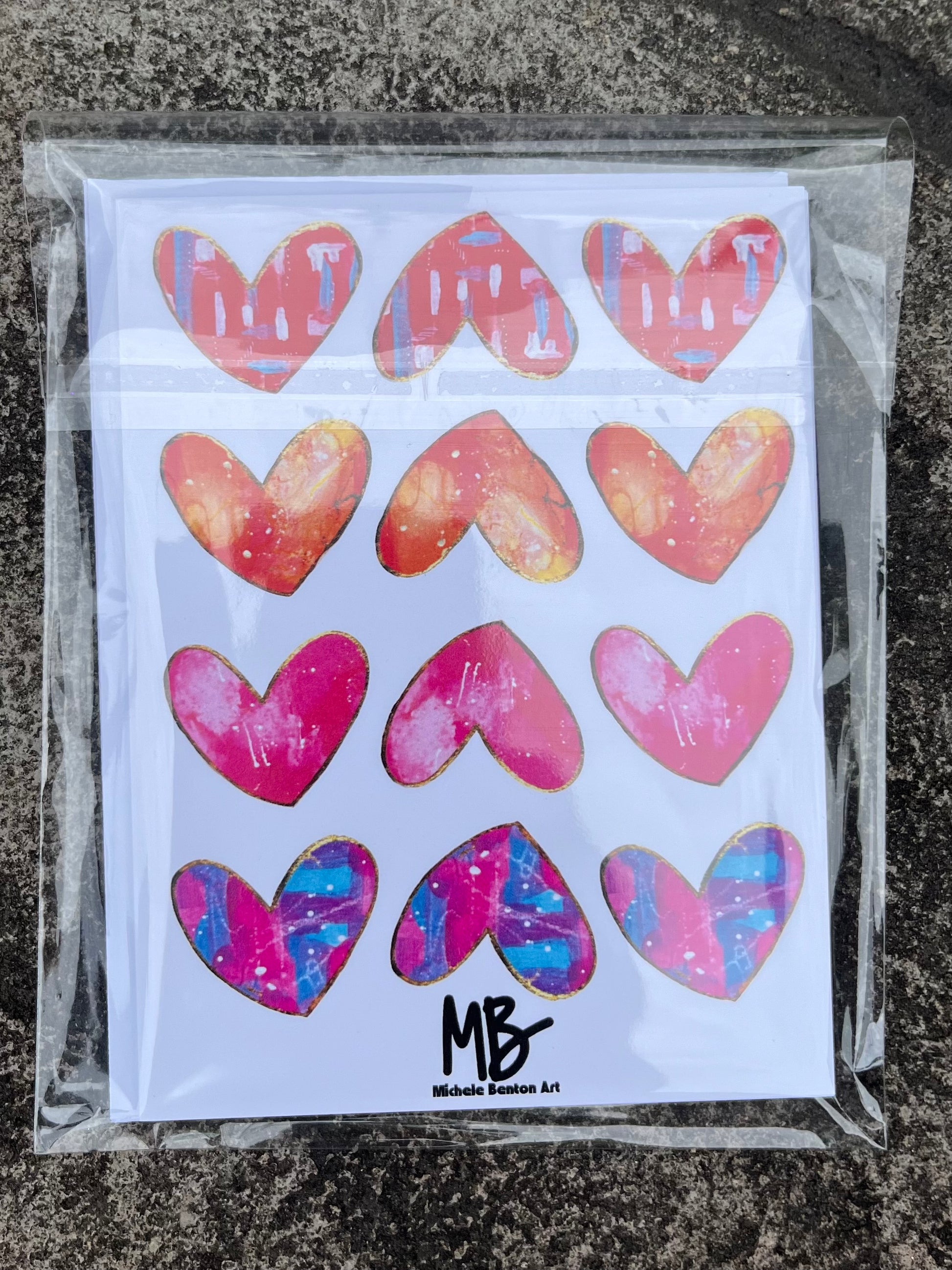 These flat notecards featuring 4 of Michele’s abstract heart designs have been professionally printed on 100lb matte cardstock. Cards measure 4.25”x5.5” and are printed on one side with a blank backside. Envelopes are included. Pack of 5.
