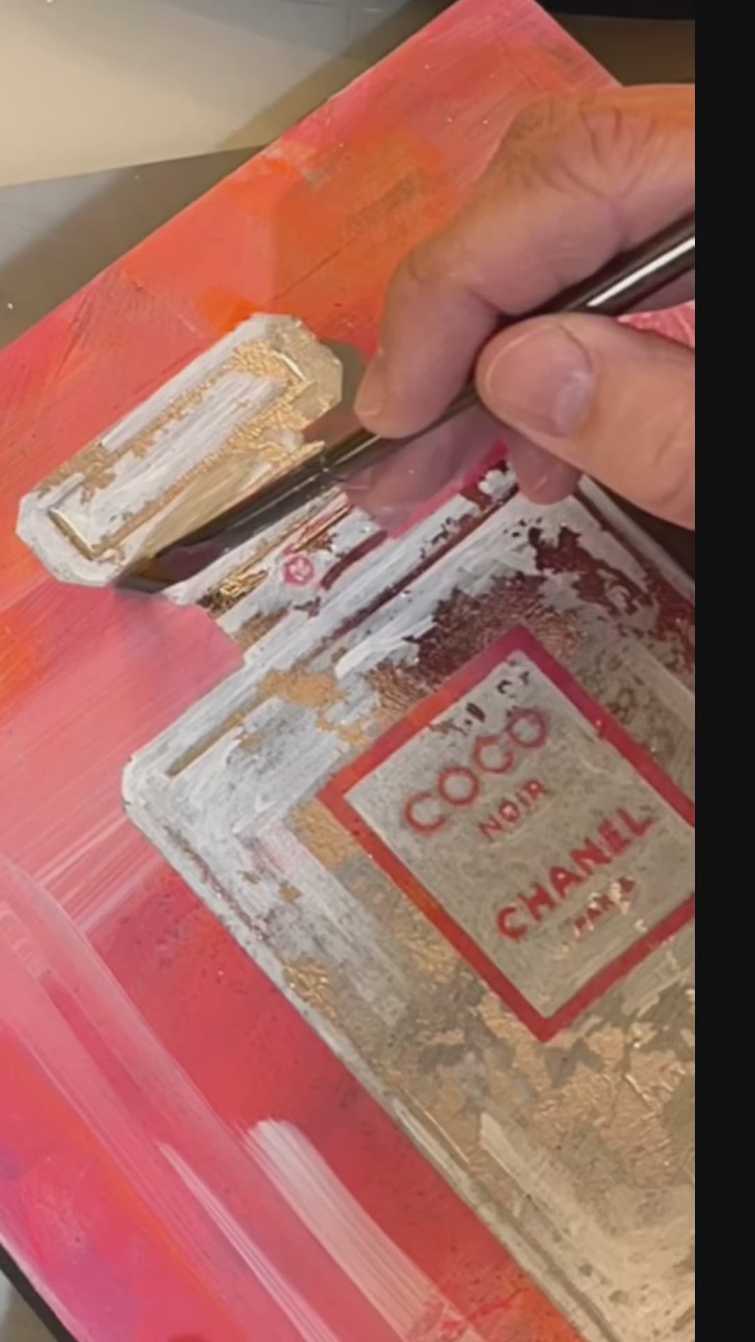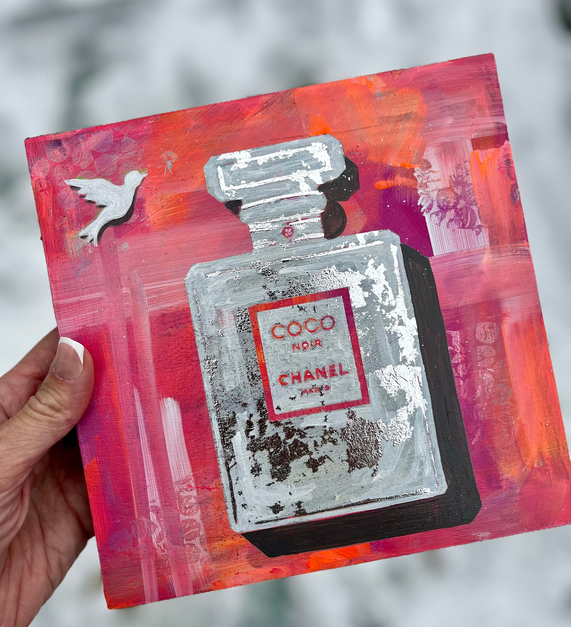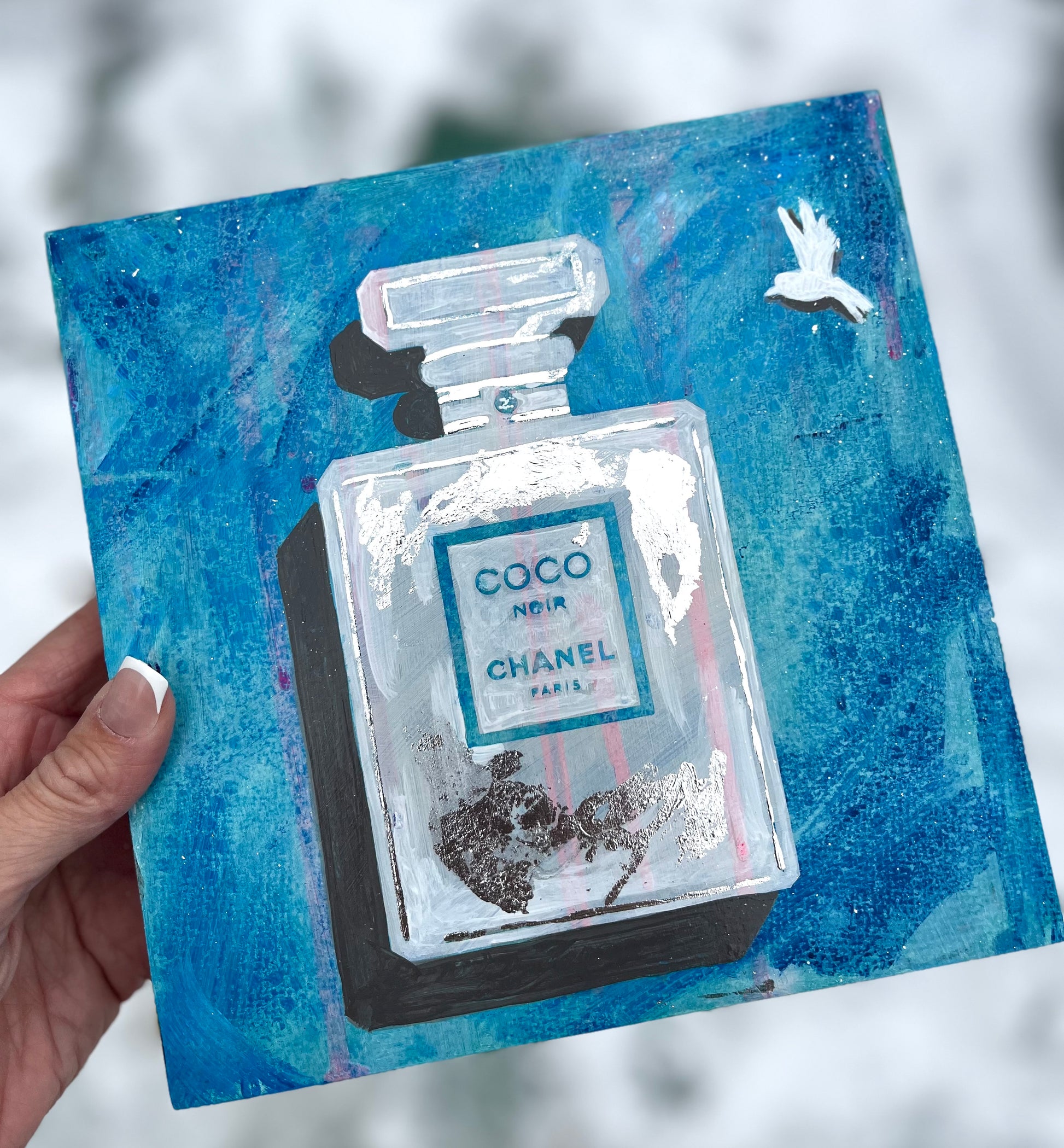 Luxury perfume inspired artwork on a cradled wood panel with silver leaf accents. Each piece measures 8”x8”x.75” and is finished with satin varnish. Can be hung with a sawtooth hanger on the back or positioned as an accent on a shelf. Choose bluish or pinkish… or both!