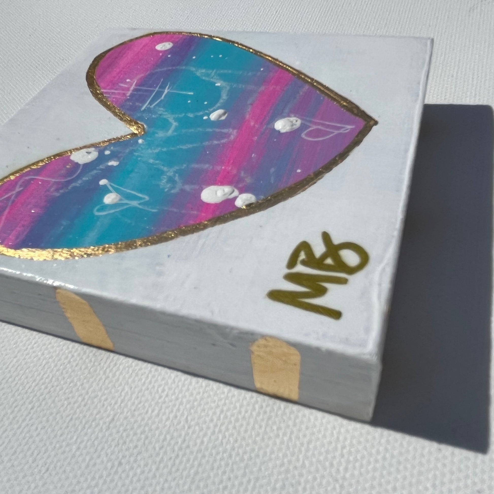 This mini heART painting measures 4”x4” and has been painted and varnished on a cradled wood panel. Each heart is lined with gold leaf, which also adorns each side of the artwork. The perfect size to collect or gift to someone special!