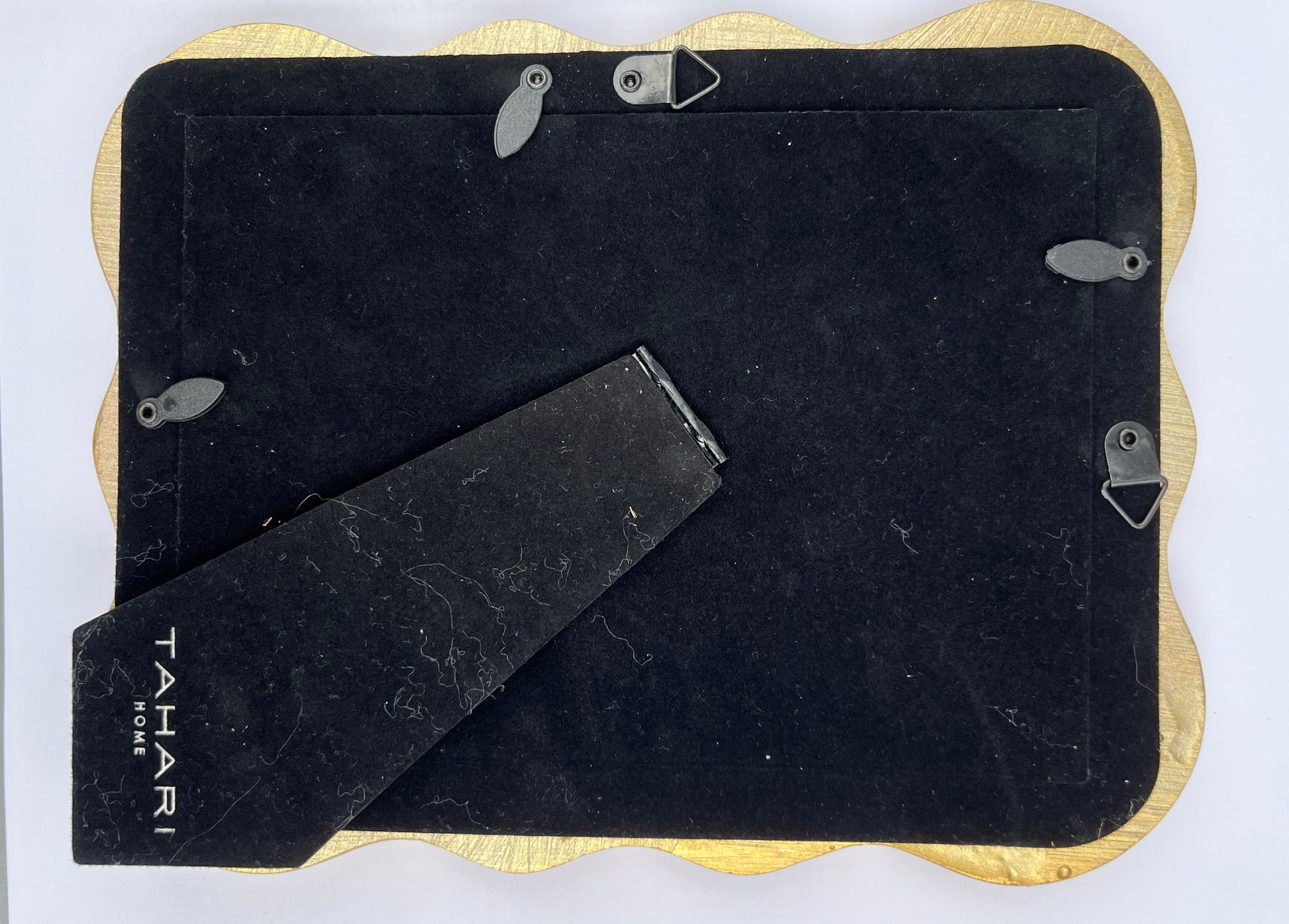 This minimalistic red & white heART painting on a 5x7 canvas panel is displayed in a wavy gold Tahari 7x9 frame. Back includes a hook to hang, or an easel to display on a shelf or desk.