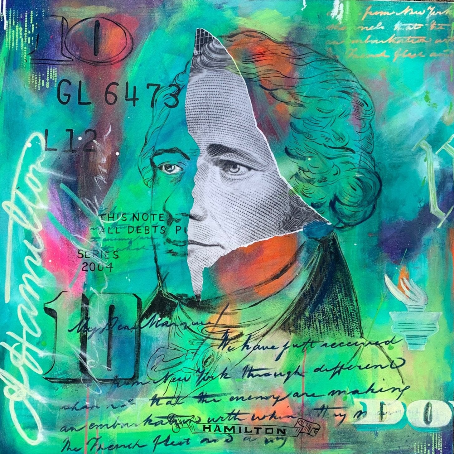 - Part of my abstract currency series, this piece was inspired by the recovery of a letter by Alexander Hamilton to the Marquis de LaFayette that was stolen eight decades ago that had been found. It was stolen from the Commonwealth of Massachusetts Archives by clerk Harold E. Perry between 1937 and 1945. Hamilton married Elizabeth Schuyler, the daughter of a prominent Albany family, so he spent quite a bit of time in New York's Capital City