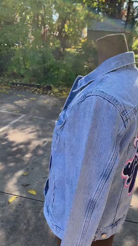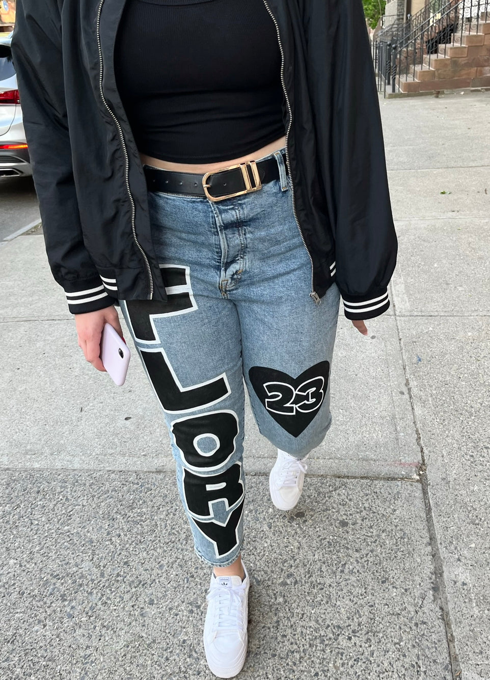 This non refundable fee reserves your spot for a custom name and number sports jacket (or jeans), which will be designed and created by Michele Benton. Pricing starts at: $150. In addition to the large number painted on the back, I will paint 1-2 additional smaller items (like a last name and/or design).