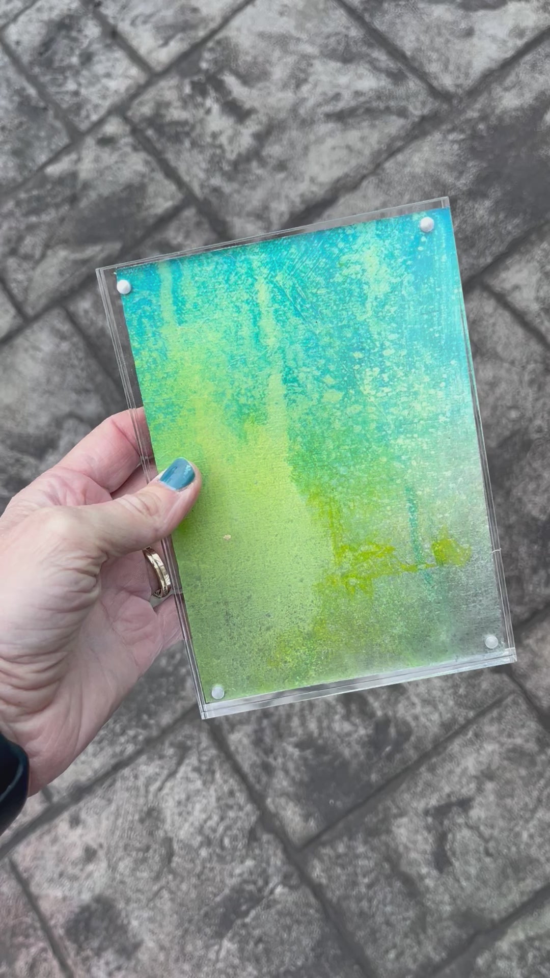 I’ve taken one of my abstract paintings on canvas and sliced it up 4 ways creating mini originals that have been added to 5” x 7” lucite frames. signed on the back