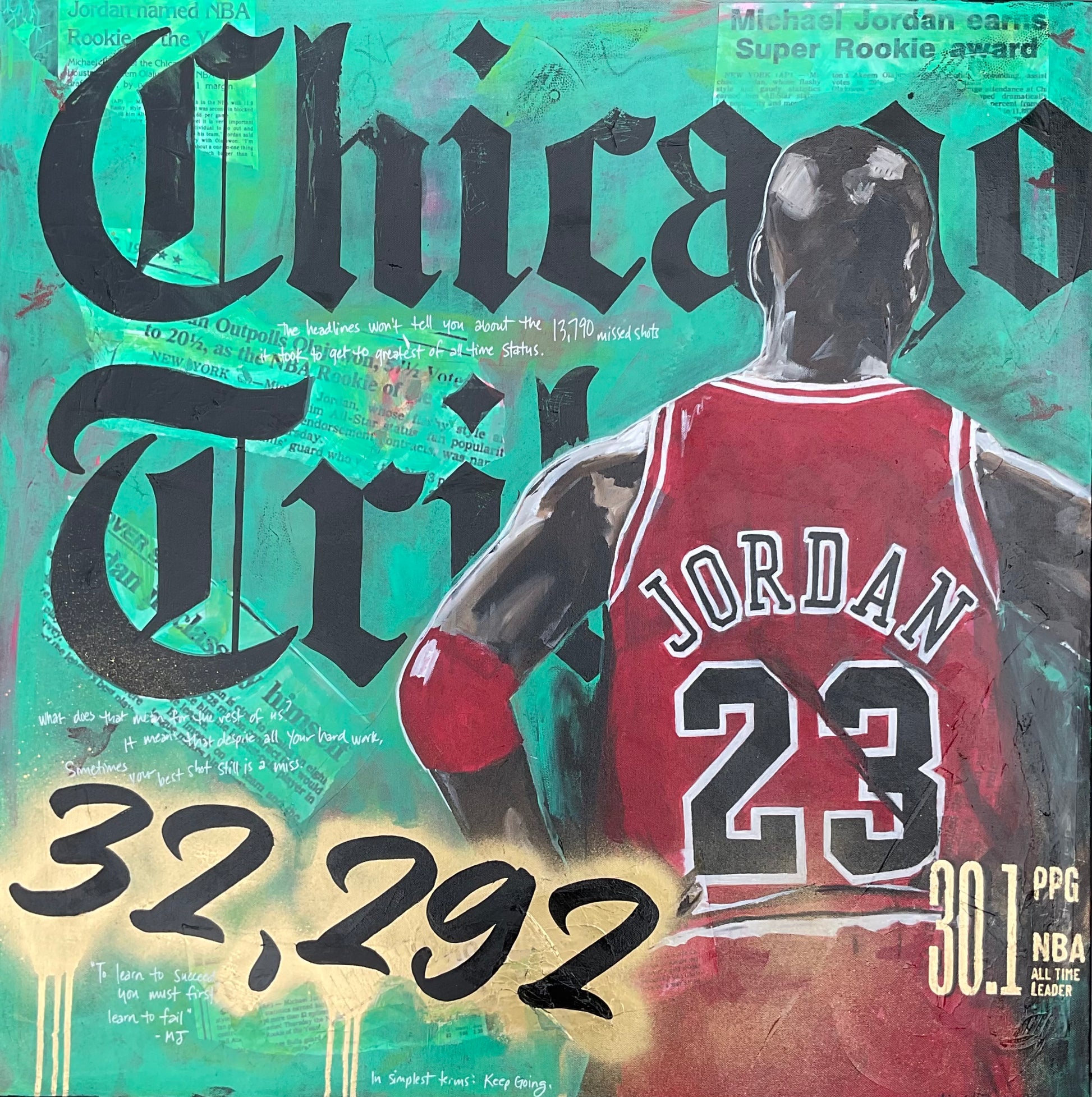 This one is called Read Between the (head)Lines. It's acrylic, newsprint, spray paint, gold leaf, and poscapens on canvas. Most of my art has some sort of story behind it, and this one is a tribute to the behind the scenes hard work and perseverance that goes into becoming great at anything, using the GOAT, Michael Jordan, as an example.
