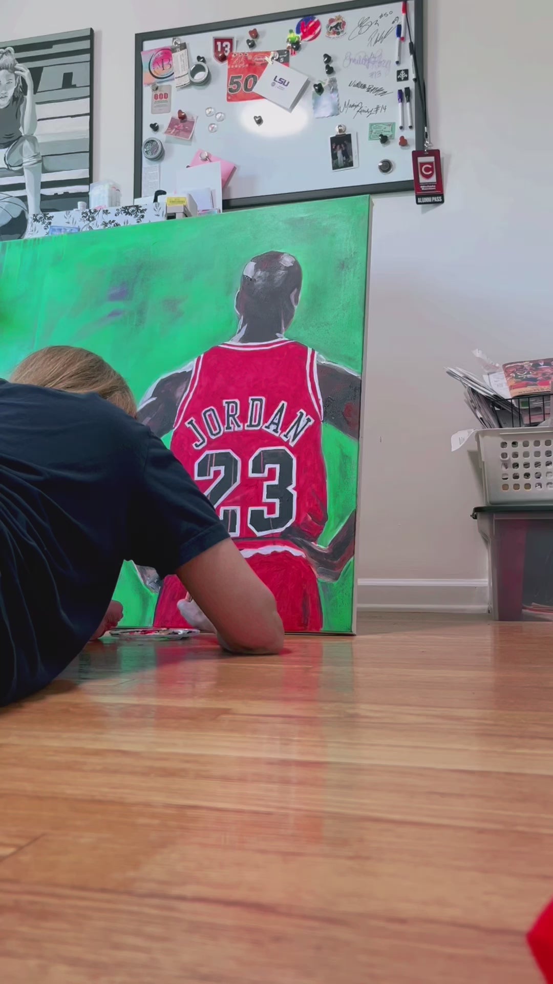 The small writing on the canvas spells out "the headlines won't tell you about 13,790 missed shots it took to get to greatest of all time status. What does this mean for the rest of us? It means that despite all your hard work, sometimes your best shot is still a miss."